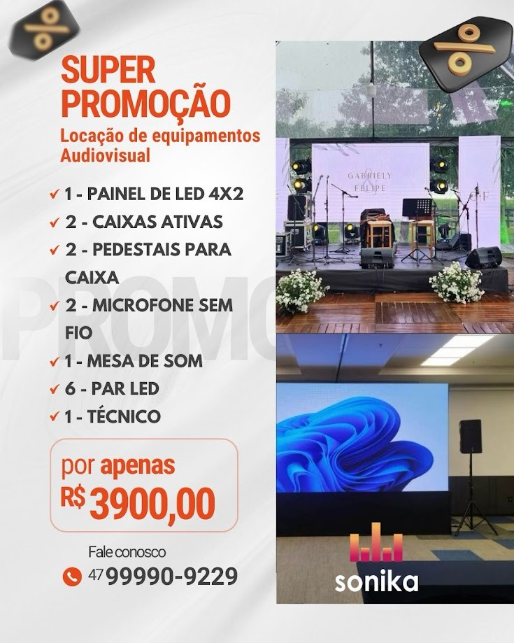 A Sonika oferece a locação de equipamentos de som, luz e estrutura para uma variedade de eventos, incluindo shows, festas, casamentos, eventos corporativos, formaturas e festas de 15 anos, atendendo a eventos de até 1500 pessoas. Com uma equipe experiente e dedicada, garantimos pontualidade e eficiência na montagem de todos os equipamentos. Além disso, trabalhamos com painéis de LED para adicionar um toque extra de brilho e modernidade aos seus eventos. Atendemos no Litoral de Santa Catarina, Paraná e regiões próximas ao litoral.